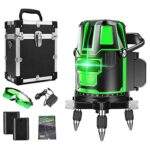 レーザー墨出し器 5ライン・グリーンの回転レーザー線。4方向大矩照射、防塵防水、自動補正機能付き。高輝度で視認性良好。日本語説明書、バッテリー2個付属。