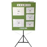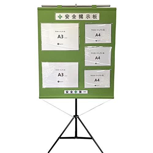 Seagronの工事管理用幕+専用スタンドセットは、屋内用でA3ヨコ×2枚、A4ヨコ×3枚の構成。若草色の不織布製でサイズは1050×880mm。フリー安全掲示板KEI03AXYとして使用可能。