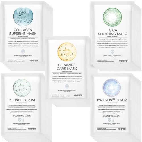 大容量50枚セットのフェイスマスク。韓国コスメのパックで、毎日のスキンケアを簡単に。個包装で使いやすく、保湿、明るさ、栄養補給、再生、輝きを与える5種類の効果を提供。