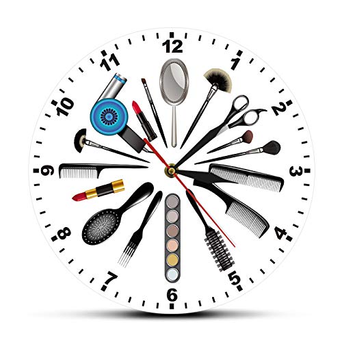 サイレントウォールクロックは、ビューティーショップやヘアカットスタジオに最適です。12インチのサイズで、アクリル製のモダンなデザイン。静音機能付きで、スタイリストやメイクアップ道具をテーマにしたおしゃれな時計です。