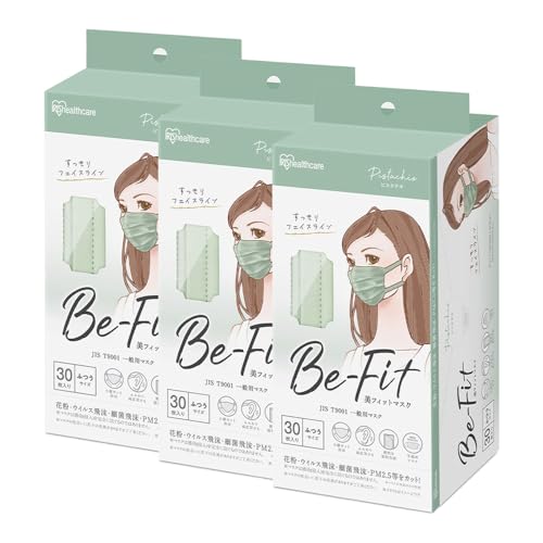 アイリスオーヤマのプリーツマスクはJIS規格適合品で、30枚入りのセットが3個あります。ふつうサイズで個包装、カラーマスクとしても使用可能。秋用や血色マスクとして美フィット設計です。