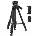 ZOCUSの三脚は、高さ1900mm、脚径26mmで5段階調整が可能。リモコン付き、3Way雲台、水準器、クイックシュー式。アルミ製でスマホホルダーもあり、キャリングバッグ付き。一眼レフやビデオカメラにも対応。