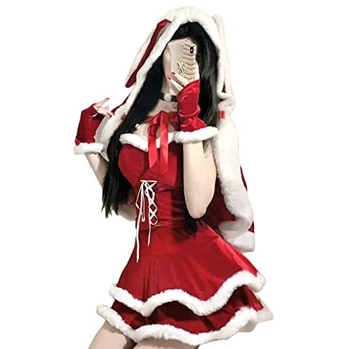 [SSUPTEMBERⅡ] ウサギ耳 バニーガール サンタ レディース クリスマス コスプレ 衣装 赤 マント ワンピース 可愛い コスチューム ボア 秋冬 仮装 パーティー 大人用 赤 (M, 兎耳マント+トップス+スカート+手袋+カチューシャ) 高価買取中