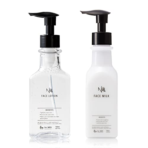 NULL メンズ化粧水と乳液のスキンケア2STEPセット。150mLの化粧水はニキビや肌荒れをケアし、145mLの乳液は乾燥を防ぐ。しっとりとした肌に導きます。