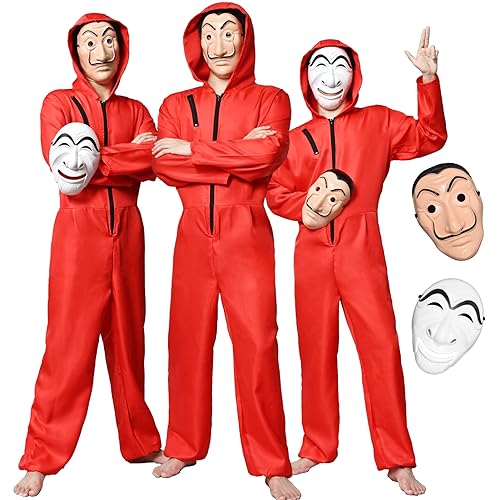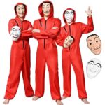 ハロウィンコスプレ用の3点セット。ペーパーハウステーマで、マスク2点とつなぎ服1つを含む。仮装やパーティー、文化祭にも最適。サイズはS。