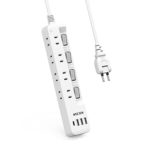 Mscienの電源タップは8個のAC口、1個のUSB-C、3個のUSB-Aを備え、3mの延長コードで雷ガード機能付き。壁掛け可能で、スイッチ付きのマルチタップとしておしゃれなデザイン。