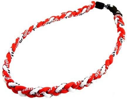メンズ・レディース向けのゲルマニウム三つ編みネックレス。34色展開でおしゃれなデザイン。スポーツシーン(ゴルフ、サッカー、マラソン、野球)に人気のアイテム。カラーは白と赤。