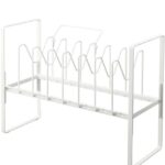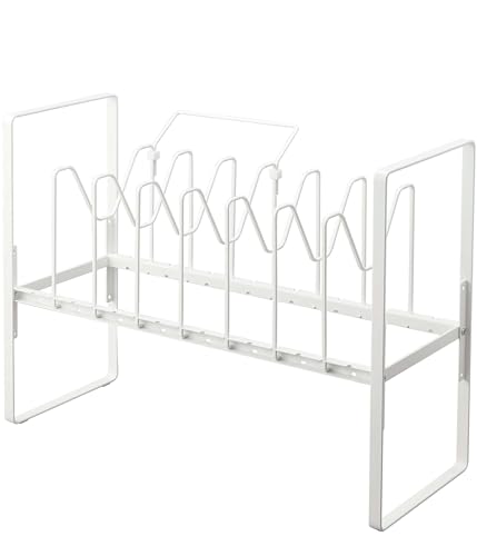 山崎実業のシンク下ラックは、高さ調整可能で鍋蓋やフライパンを収納できます。2段構造で約W52×D26×H38~41cm。7本仕切りパーツ付きで、手持ち置きも便利。タワーシリーズのホワイトです。