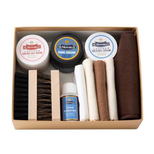 M.モゥブレィの革小物ケアセット。デリケートクリーム、アニリンカーフクリーム、シュークリームブラックの3種類がミニサイズで含まれたAmazon限定のシューケアキットです。