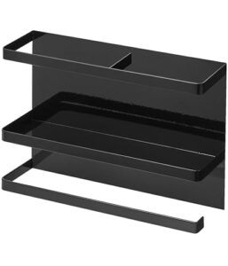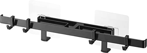 山崎実業のフィルムフックサニタリーハンガーは、約W30.5×D4×H4.7cmのサイズで、浮かせて収納できる洗面収納です。ブラックのデザインで、93604タワーシリーズの一部です。