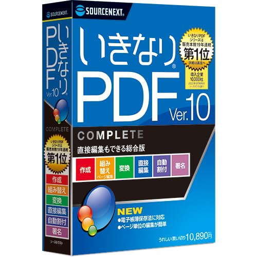 ソースネクストのいきなりPDF Ver.10 COMPLETEは、PDFの作成、編集、変換が可能なWindows対応ソフトです。簡単な操作で高機能を実現し、多彩なファイル形式にも対応しています。