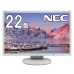NECの22型ワイド液晶ディスプレイEA223WMシリーズ。スピーカー内蔵、VGA・DVI・Display-Portの3系統入力を備え、解像度はSXGA(1680×1050)。HDCP機能対応、VESA規格にも対応。