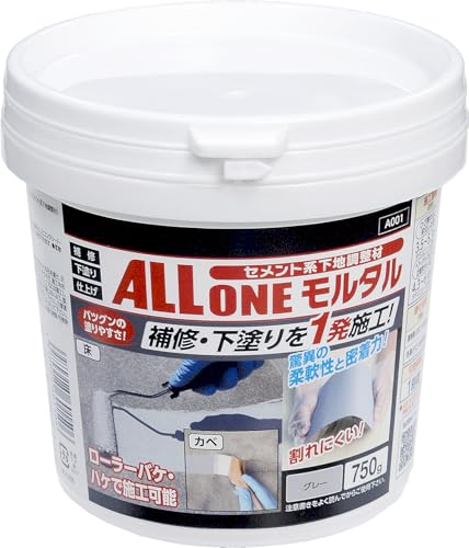 アサヒペン セメント系補修材 オールワンモルタルは、750gのグレーで、下地調整材や補修・塗料の下塗りに使用可能です。柔軟で割れにくく、屋内外のコンクリートやモルタルに適した日本製の製品です。