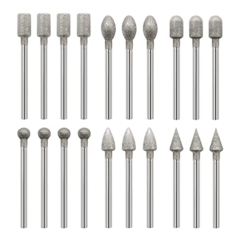 超硬バーシャンク径3mmのリュータービット20本セット。ダイヤモンドビットで、石・宝石・ガラス・セラミックスの彫刻や研磨に最適。高品質な研削性能が魅力です。