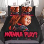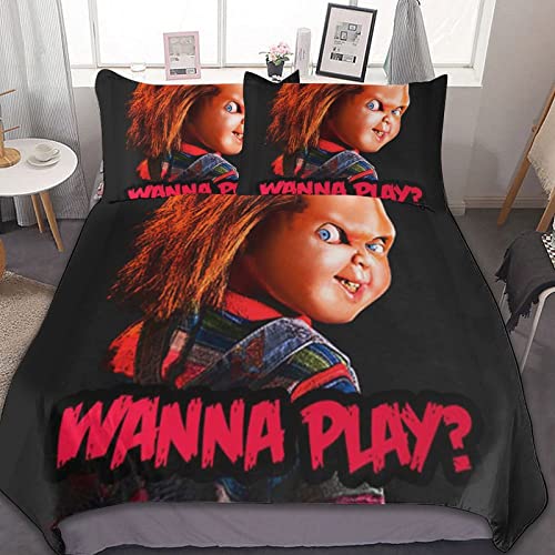 チャッキーの布団カバー3点セットは、シングルサイズで掛け布団カバー、ボックスシーツ、枕カバーが含まれています。洋式・和式兼用、防ダニ、洗い替えに便利な速乾タイプです。サイズは79インチ x 90インチ。