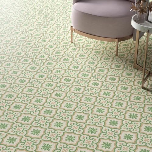 壁紙屋本舗のクッションフロアは、約90cm幅の緑色タイルデザインです。サイズは約91cm×150cm(1.5m)で、拭き掃除が可能。トイレや玄関に最適な賃貸用フロアシート。受注生産品でキャンセル不可です。
