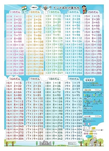 お風呂で学べる防水A3サイズのインド式かけ算表。九九(11〜19の段)が掲載され、5秒で解ける暗算教室もあって、楽しく計算を習得できます。