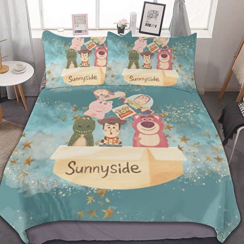 トイストーリーの布団カバー3点セット。シングルサイズ、掛け布団カバー、ボックスシーツ、枕カバー入り。洋式・和式兼用、防ダニ、速乾タイプ。サイズは102″x90″。