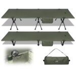 ウルフヨックアウトドアーズのコットは、軽量で高耐荷重(150KG)、高密度1000Dオックスフォード素材使用。折りたたみ式でハイ/ロー切替可能。通気性・撥水性に優れ、収納バッグ付き。