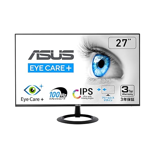 ASUS VZ27EHFは27インチのフルHD IPSモニター。100Hz、1ms MPRT、Adaptive-Sync対応。ブルーライト軽減機能とフリッカーフリー設計により、目にも優しい。壁掛け可能で3年保証付き。