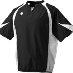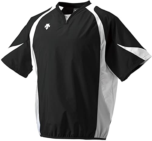 DESCENTE(デサント)の野球プラクティスウェア、半袖ウインドジャックPJ-321B。メンズ向け、カラーはブラック×ホワイト×シルバー。軽量で動きやすく、練習時に最適なデザインです。