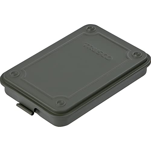 トラスコ中山のトランク型工具箱T-15MODは、サイズ154×105×29mmで、つや消しオリーブドラブのデザイン。軽量で持ち運びに便利です。内部は仕切り付きで整理整頓が簡単。