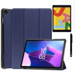 Lenovo Tab M10 (3rd Gen)およびLAVIE Tab T10用の手帳型カバー。タッチペンと専用フィルム2枚付きで、シンプルで軽量。薄型デザインで持ち運びに便利です。