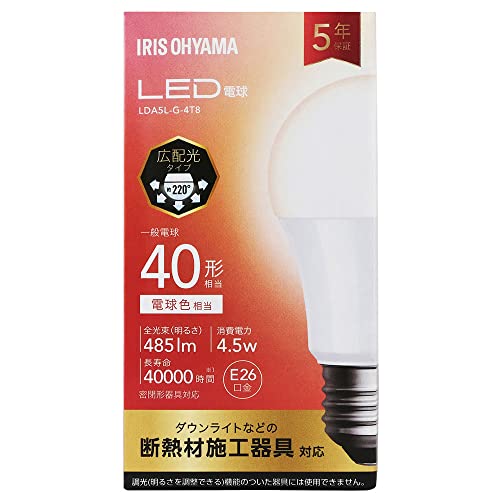 アイリスオーヤマのLED電球E26、広配光設計で明るさは40W相当、電球色(LDA5L-G-4T8)です。省エネ性に優れ、長寿命で使いやすい照明器具になります。