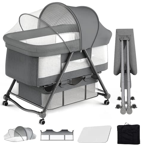 UBRAVOOのベビーベッドは、ゆりかごタイプで折りたたみ可能。組み立て不要で、キャスター付きで移動も便利です。通気性が良く、洗濯しやすい素材で、蚊帳と収納袋、マットも付属。新生児用で0ヶ月から使用可能(灰色)。