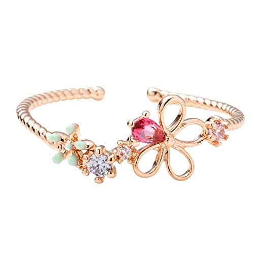 クリームドットのリングはビジュー付きのフラワーデザインで、オープンリングとして楽しめます。ねじりツイストが特徴的で、マルチカラーが魅力。ピンクゴールドのフリーサイズで、メルヘンチックな印象を与えます。