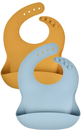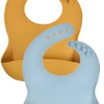 rinaty(リナティ)のお食事エプロンは、シリコン製で2枚組。くすみ色のブルー&イエローが特徴で、食事の際の汚れを防ぎます。柔らかく、軽量で使いやすいデザインです。