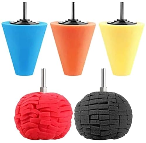 電動ドリル用の研磨バフです。スポンジコーンパッドとボールパッドが付属し、洗車や研磨作業に最適。5本セットで様々な用途に利用可能なポリッシャースポンジです。