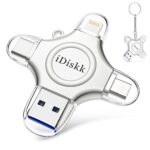 APPLE Mfi認証済みのiDiskk 4in1 USBメモリは、512GBのストレージを提供し、iPhone 15を含むiPhone、iPad、Mac、Android、PCと互換性あり。Lightning、USB、Type-C、Microコネクタを搭載し、ワンクリックで自動バックアップ可能。