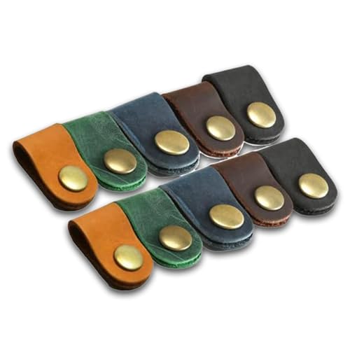 亀登鞄製作所のケーブルクリップ10個セットは、本革製でキャメル、こげ茶、ブラック、ブルー、グリーンの5色展開。サイズは長さ8cm、幅2.3cmで、ケーブルやコードを美しくまとめるのに最適です。