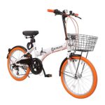 折りたたみ自転車、20インチの小径車。シマノ6段変速付き、カゴ、ワイヤ錠、ライトがプレゼント。前後泥除け装備、ハンドル高調節可能。色はホワイト×オレンジ。