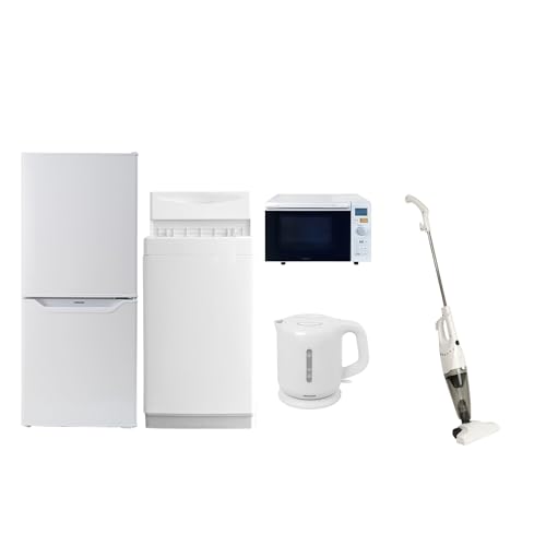 [山善] 新生活家電5点セットは、一人暮らしに最適なアイテムです。106Lの冷蔵庫、6kgの洗濯機、18Lのオーブンレンジ、ケトル、掃除機を含み、ホワイトのシンプルなデザインで、機能性とスタイルを兼ね備えています。