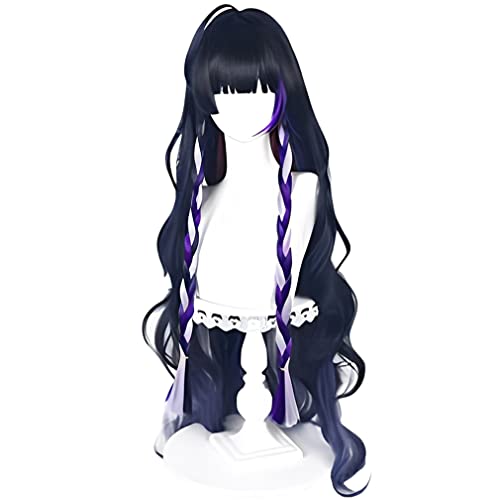 LAOBAOのコスプレウィッグは、狂蘭メロコKyoranのデザイン。ロングカールの黒紫色で、おさげや三つ編み、ツインテールスタイルが楽しめます。耐熱素材で、ハロウィンやパーティーに最適な仮装用ウィッグです。