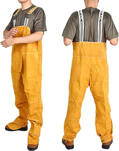 [Wpunwen] 耐久性 牛革作業服 オーバーオール 作業服 防護服 電気溶接防護服 オールインワン 全牛革溶接防護服 作業服ズボン 防護具 防炎防炎 やけど 対策 通気性 耐火性 耐熱性 男女兼用 (XL:168-176CM, イエロー)