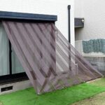 山善の日よけシェードは、サイズ2×3mで高通気性、UVカット機能を備えています。水洗いが可能で、ボーダーブラウンのデザインが特徴です。