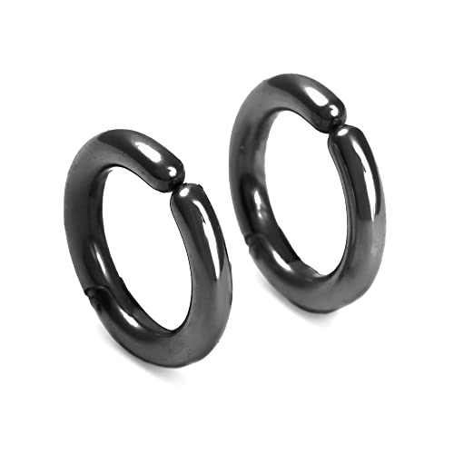 PLUSTERのシンプルな15㎜フープイヤリング。金属アレルギー対応のステンレス製で、ガンメタル色。男女兼用、誕生日プレゼントやジュエリーに最適。専用ポーチ付き。