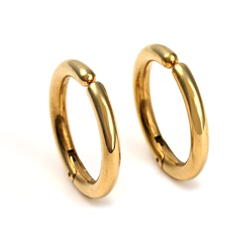 PLUSTERのイヤリングはシンプルなフープデザインで、ステンレス製の19㎜サイズ。金属アレルギー対応のイエローゴールド仕上げで、男女問わず使えます。専用ポーチ付きで、誕生日やプレゼントにも最適です。