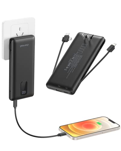 Charmastモバイルバッテリー(10000mAh)は、折畳みプラグと2本のケーブルを内蔵。3A急速充電、LED残量表示、ACコンセント一体型。Type-Cポートで4台同時充電可。軽量・薄型・小型で、iPhone/Android対応。PSE認証済み。