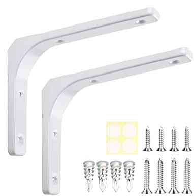 250mm×200mm×30mmの白棚受け金具2本セットです。L字型でスチール製、サイズは25cm。ネジ・ボードアンカー・穴隠しシール付属。取り付け説明書付きで簡単設置可能です。