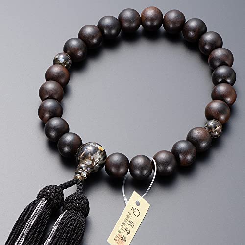 仏壇屋 滝田商店の京念珠は、男性用の縞黒檀(艶消)で、ブラックシェル仕立ての22玉です。正絹の頭付房と数珠袋が付属し、すべての宗派で使用可能。証明書付きの品質保証があります。