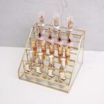 クリアリップスティックオーガナイザーは、ガラスとアクリル素材でできたコスメ収納が特徴です。口紅やネイルポリッシュを整理でき、ゴールドのデザインで美しく、使いやすい収納アイテムです。
