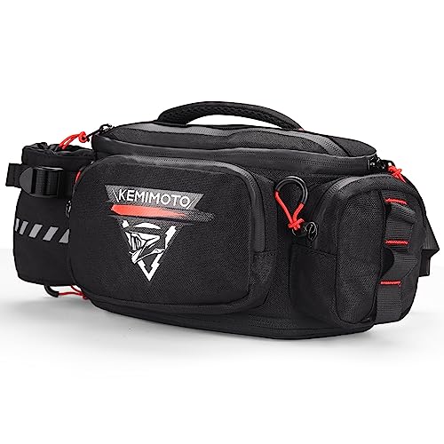 KEMIMOTOのバイク用ウエストバッグは、5Lの大容量で撥水加工された防水仕様。調節可能なベルト、仕分けポケット、飲料ホルダー付きで、男性・女性問わずアウトドアに最適なツールバッグです。