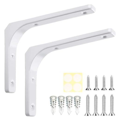100mm×100mm×20mmの白い棚受け金具2本セット。L字金具でスチール製、10cmのサイズ。付属品にはネジ、ボードアンカーネジ穴隠しシール、取り付け説明書が含まれています。