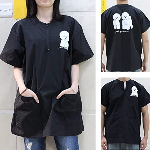 Umoraの半袖ペット美容師スモックは、帯電防止・防水仕様で安心。犬猫のグルーミング作業着として最適で、2つのポケット付き。ビションフリーゼLに対応。
