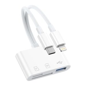 iPhone/iPad用SDカードリーダー。2025 MFi認証取得。Lightning接続で4in1機能。SD/TFカード対応、データ転送と充電が同時可能。設定不要で、写真や動画、書類も簡単に読み込み。日本語説明書付き。