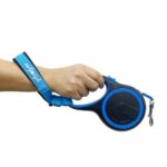 カラフルな伸縮リード&ストラップセット。3m、5m、8mの長さから選べ、頑丈で自動巻き取り機能あり。大型犬や小型犬の散歩に最適。お出かけに便利なデザイン。色はブルー。